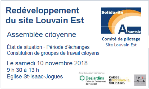 Le comité de pilotage du site Louvain invite les citoyens intéressés par le dossier à l’église Saint-Isaac-Jogue ce samedi 10 novembre, dès 9 h 30. Il s’agira de la deuxième assemblée citoyenne à se tenir à cet endroit pour discuter de l’avancement du dossier, la première ayant eu lieu en septembre 2017.
