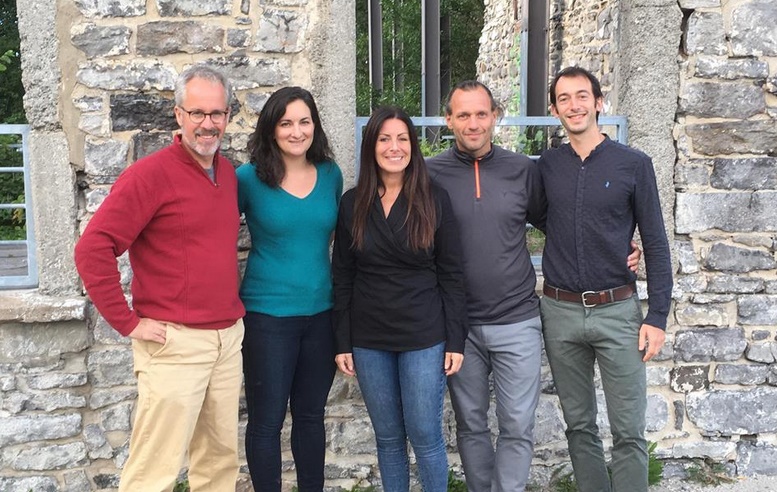 Les candidats de la circonscription Maurice-Richard se sont prêtés au jeu de la rencontre individuelle avec les citoyens du Sault-au-Récollet. Ici, adossés aux vestiges des Moulins, on aperçoit, de g. à dr.: Frédéric Lapointe (PQ); Marie Montpetit (PLQ); Manon Gauthier (CAQ); Gilles Fournelle (PV); et Raphaël Rebelo (QS). (Photo: Courtoisie ACIV)