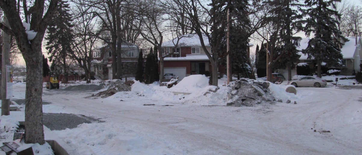 « Il n’y a eu que très peu d’activités depuis la coulée de béton d’une bordure et du trottoir la semaine dernière exception faite du façonnement de petits remblais en agrégat concassé pour l’accès aux entrées. On nous promet un grand nettoyage et la pose d’une couche de concassé suivie de celle d’un bitume temporaire à la grandeur de la rue pour l’hiver, lundi prochain, avant la pause hivernale prévue pour le 23 décembre.»