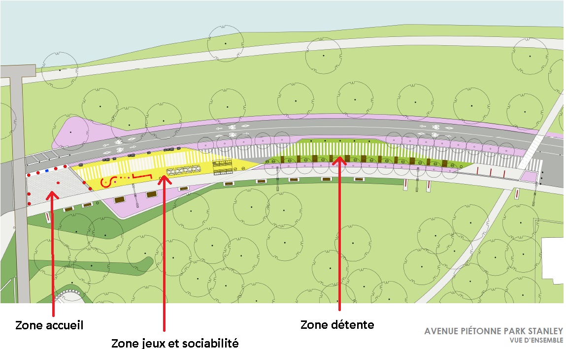L’installation permanente consisterait en trois zones La zone d’accueil (à l’ouest) serait dégagée, ce qui permettrait le yoga ainsi que la danse.  La zone de sociabilité (au centre) aurait notamment des jeux pour enfants suivi d’une zone de détente plus à l’est.  En plus du mobilier existant, il y aurait entre autres, ajout de tables, bancs et balancelles.  Il y aurait également plantation d’arbres et d’arbustes pour aider à diminuer les îlots de chaleur et aussi pour aider à délimiter la zone piétonnière de la piste cyclable, le tout sans affecter la vue sur la rivière.