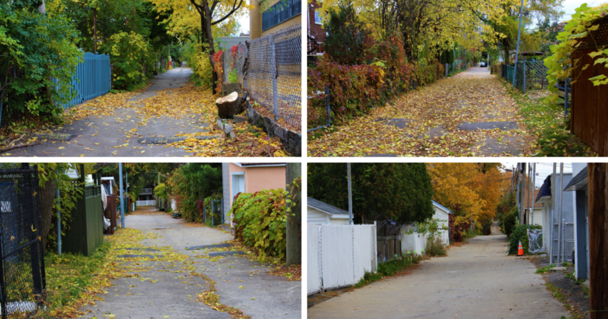 Dans le sens des aiguilles d’une montre, les ruelles devant être aménagées en 2019: ru’Eldorado; ruelle Charles-Baril; ruelle Hélène-Desportes; ruelle St-Hubert-Péloquin. (Photos et montage: jdv S. Lapierre)