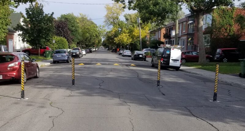 Bollards et dos d’âne de la rue Jeanne-Mance, entre les boulevards Gouin et Henri-Bourassa. (Photo: Philippe Rachiele, JDV)