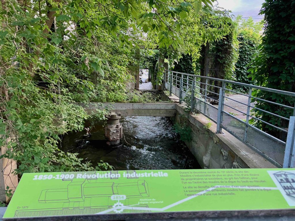 Dès 1726, un premier moulin est mis en marche sur cette digue, du côté de l’île de la Visitation. Il s’agit d’un moulin à scier le bois en planches, pour que les nouveaux habitants puissent se loger rapidement. Dès l’année suivante, un second moulin, pour moudre le blé, est érigé du côté de l’île de Montréal. La farine de blé est, à l’époque, un élément capital de l’alimentation des colons français.