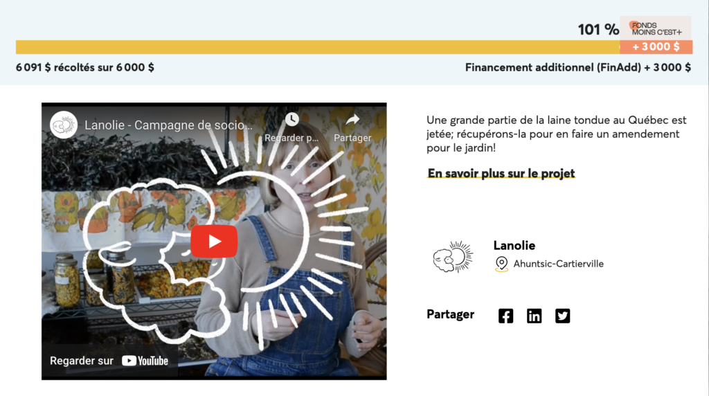 Elle a pu récolter plus de 6000 $ (101 % de son objectif) sur la plateforme La Ruche, ce qui lui a valu une «bonification» de 3000 $ de la part du Fonds Moins c’est + (FMC+), une initiative conjointe de RECYC-QUÉBEC et de La Ruche.