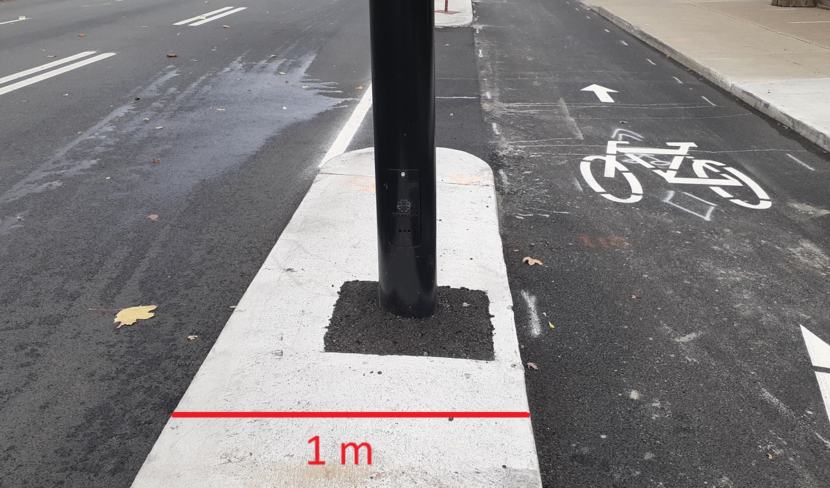 Les mails de béton entre la piste cyclable et la voie réservée aux autobus mesurent 1 m de large pour permettre l’ajout de poteaux de signalisations et de fûts de feux de circulation. Photo et ajout : JDV / Philippe Rachiele