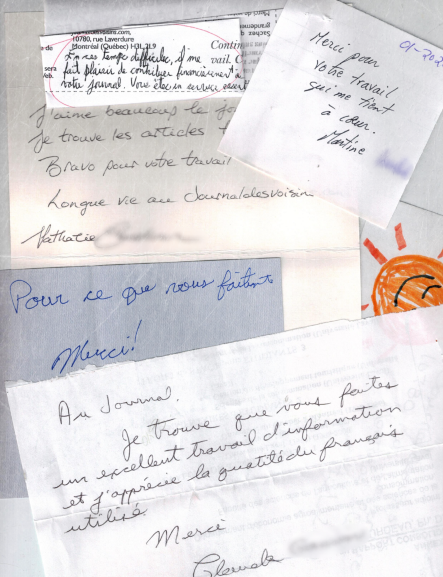 Journaldesvoisins.com veut vous faire part des témoignages reçus de nos lecteurs et lectrices au cours des dernières semaines et des derniers jours. Voici donc, cette semaine, des témoignages écrits reçus par la poste avec la contribution sonnante et trébuchante de nos lecteurs et lectrices… Nous verrons les courriels une prochaine semaine. Merci à nos lecteurs et lectrices qui nous lisent Web et papier. C’est leur appui qui nous motive à continuer!