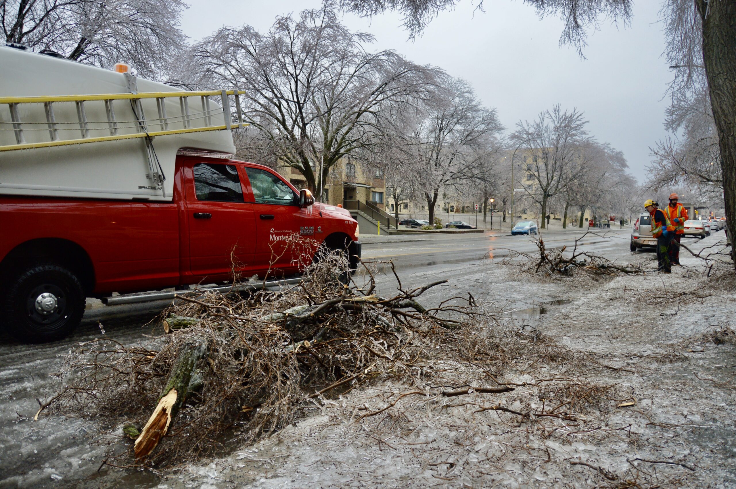 Un des employés nous a expliqué que leur tâche était de «sécuriser» les voies publiques, en regroupant sur le bord des trottoirs les branches tombées sur le terrain des résidants et dans la rue. D’après lui, c’est surtout les ormes qui sont fragiles et leurs branches se rompent facilement sous le poids de la glace.