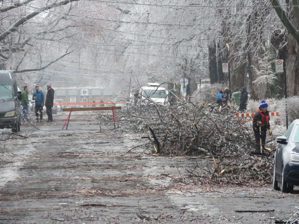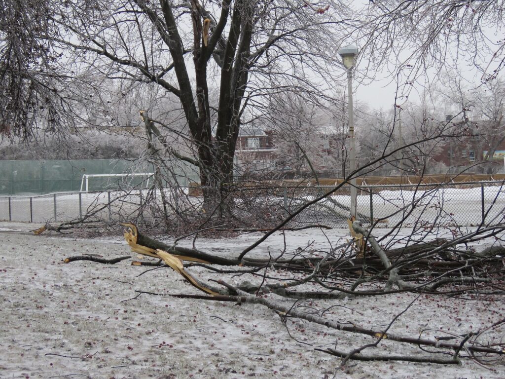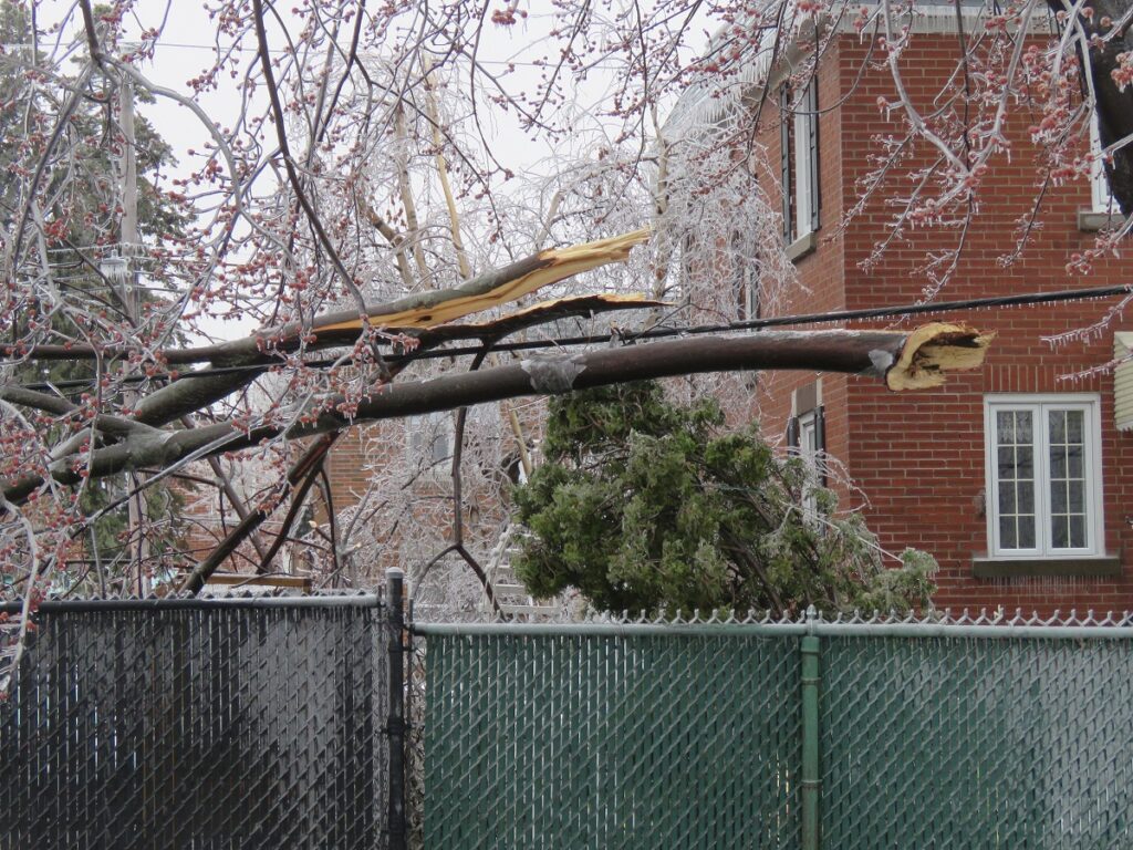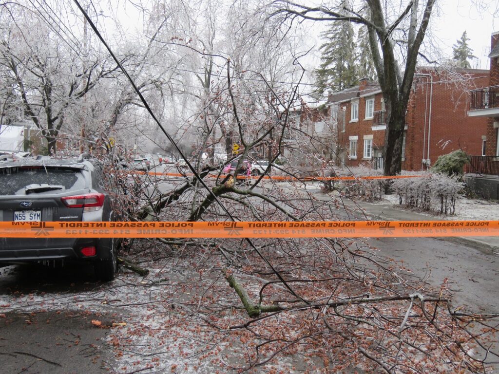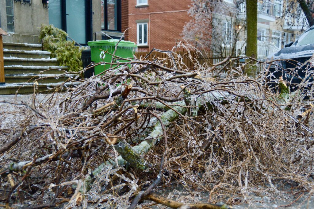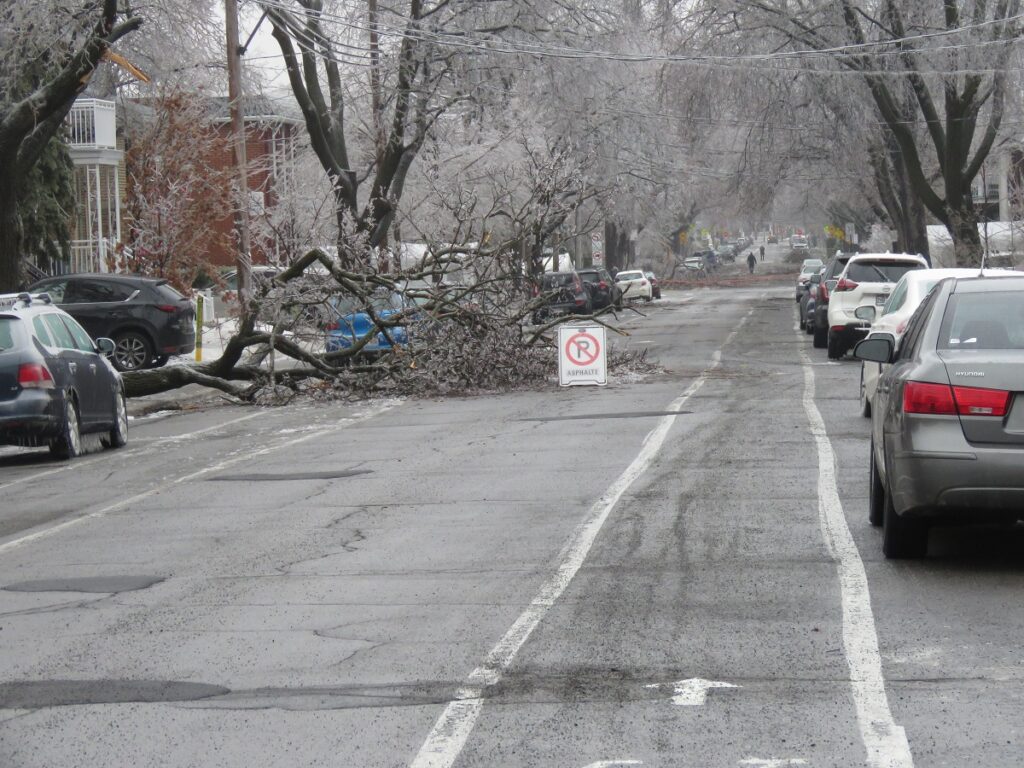 Le verglas a fortement endommagé les arbres, nombreux et vieillissants à Ahuntsic-Cartierville, causant des bris et des chutes de branches, avec les conséquences que l’on connaît: fils électriques et transformateurs cassés causant des pannes de courant, rues et terrains jonchés de débris, feux de circulation éteints, personnes blessées, maisons et voitures endommagées, écoles, bibliothèques et commerces fermés…