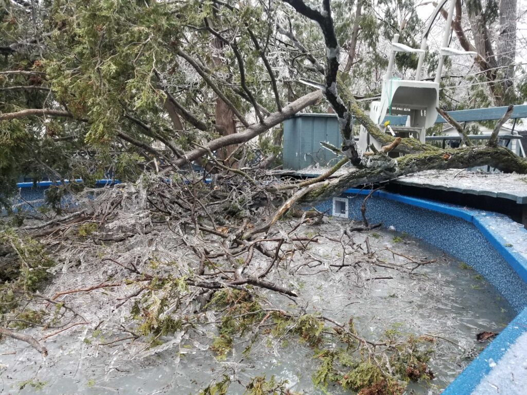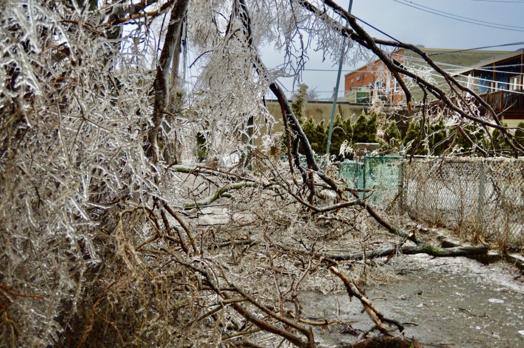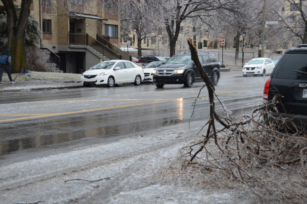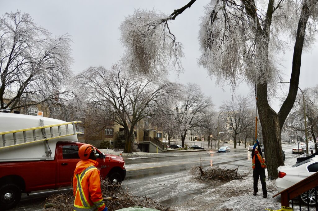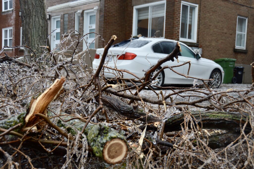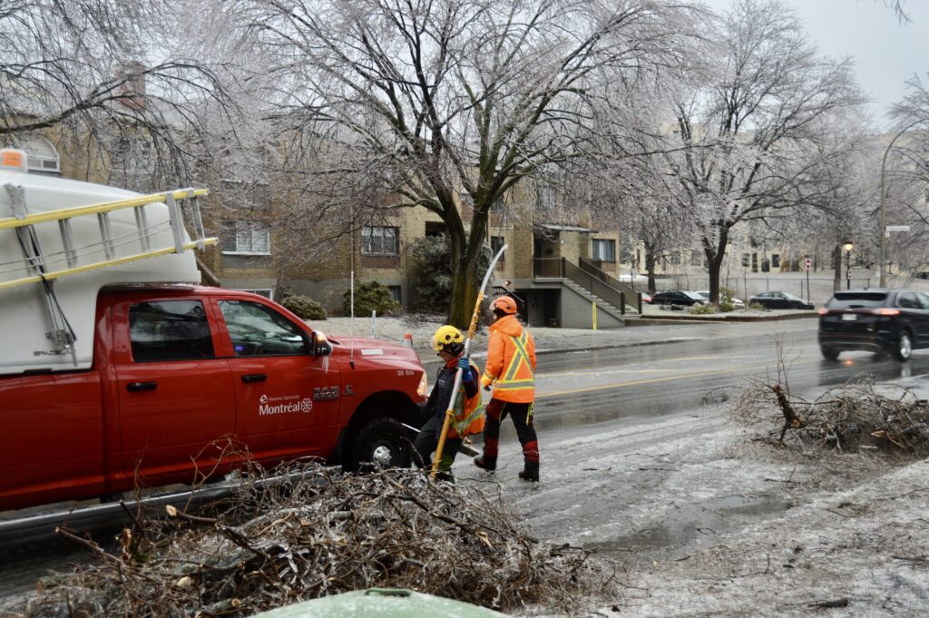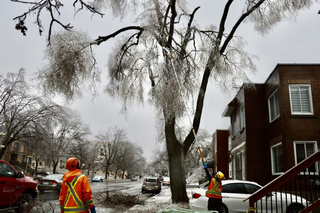 Le verglas a fortement endommagé les arbres, nombreux et vieillissants à Ahuntsic-Cartierville, causant des bris et des chutes de branches, avec les conséquences que l’on connaît: fils électriques et transformateurs cassés causant des pannes de courant, rues et terrains jonchés de débris, feux de circulation éteints, personnes blessées, maisons et voitures endommagées, écoles, bibliothèques et commerces fermés…