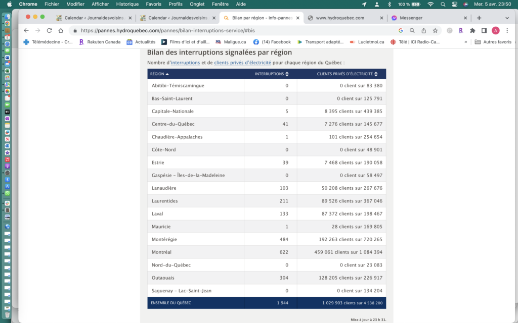 Verglas 5 avril 2023. Bilan des interruptions et des clients privés d’électricité au Québec par région à 23 h 30. (Image: courtoisie Info-pannes, Hydro-Québec)