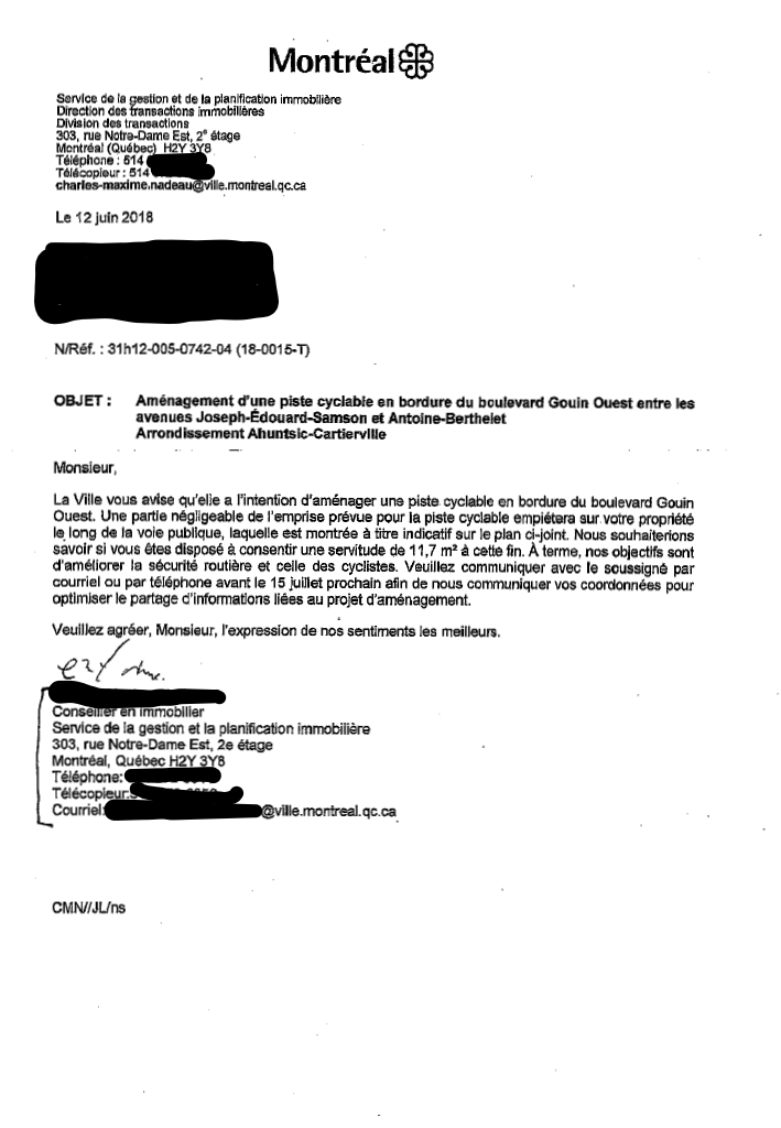 L’employé du service de la gestion immobilière de la Ville-centre qui aurait envoyé cette lettre était seulement au fait d’une partie du dossier, à savoir qu’une piste cyclable empiéterait légèrement sur le terrain de certains citoyens, et qu’à ce titre, la Ville-centre devait leur demander une servitude.