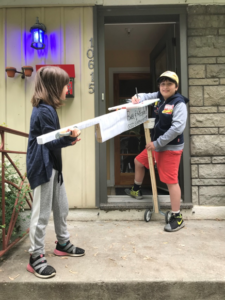 La famille a également mis au point un outil permettant de signer la pétition tout en respectant les normes de distanciation physique. Celle-ci impliquait de longs morceaux de bois placés en forme de L, comme le démontre la photo ci-contre. Les enfants ont également apporté des pancartes afin d’illustrer leurs points de vue.