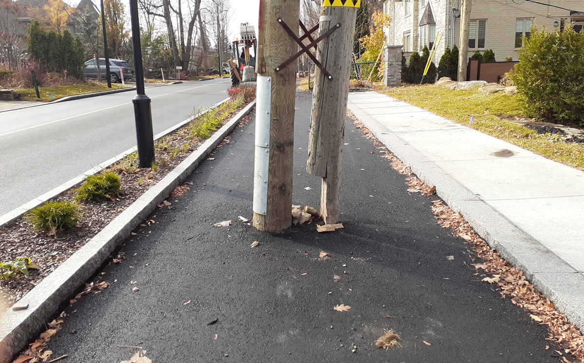 «Les poteaux électriques, dont certains se trouvent sur la chaussée, sur le trottoir ou sur la future piste cyclable, devraient être retirés d’ici 2028», selon la documentation distribuée par la Ville-centre aux citoyens dans le secteur Saraguay, à l’extrémité ouest d’Ahuntsic-Cartierville.