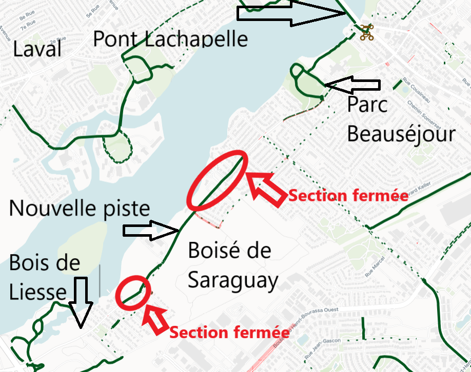 Le nouveau lien cycliste demeurera fermé sur deux tronçons (entre les avenues Martin et Le Mesurier et entre l’avenue Joseph-Saucier et le boulevard Toupin) pour assurer la sécurité des cyclistes jusqu’au retrait des poteaux, ajoute Hugo Bourgoin.