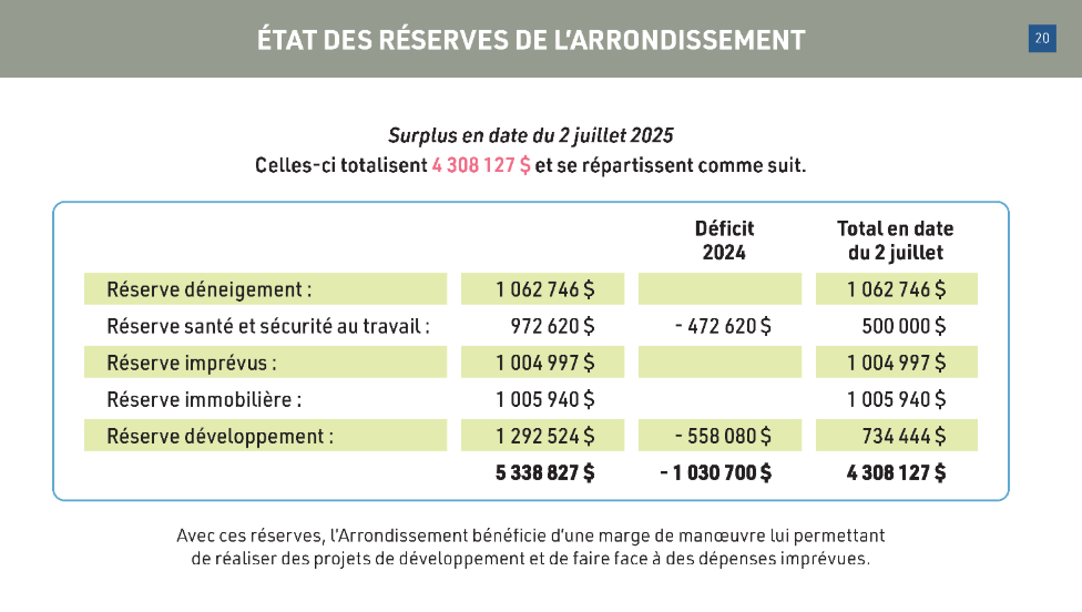 Le budget financier pour l’année 2025 est de 67 367 100$. Pas moins de 50 actions devraient être concrétisées cette année.  À la date du 2 juillet, l’arrondissement a un surplus d’environ 4,5M$.