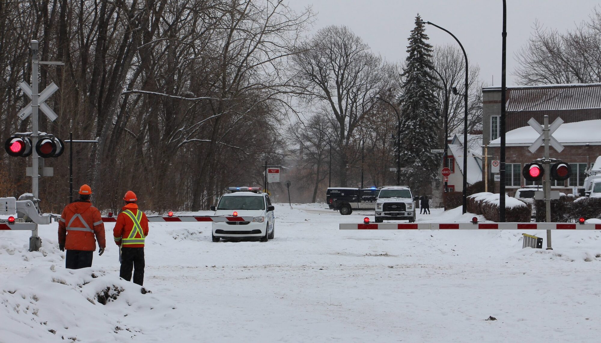 Peu après l’heure de pointe, ce matin, au passage à niveau, non loin de la rue Poincaré et du boulevard Gouin Ouest, alors qu’il neigeait à plein ciel, un train est entré en collision avec une auto engagée sur les rails. Le conducteur de la voiture est décédé et son passager est toujours dans un état critique.