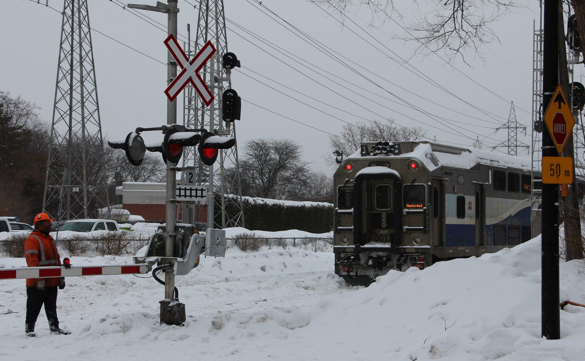 Passage à niveau sur Gouin Ouest, non loin de la rue Poincaré (EXO, avec ajout du jdv)