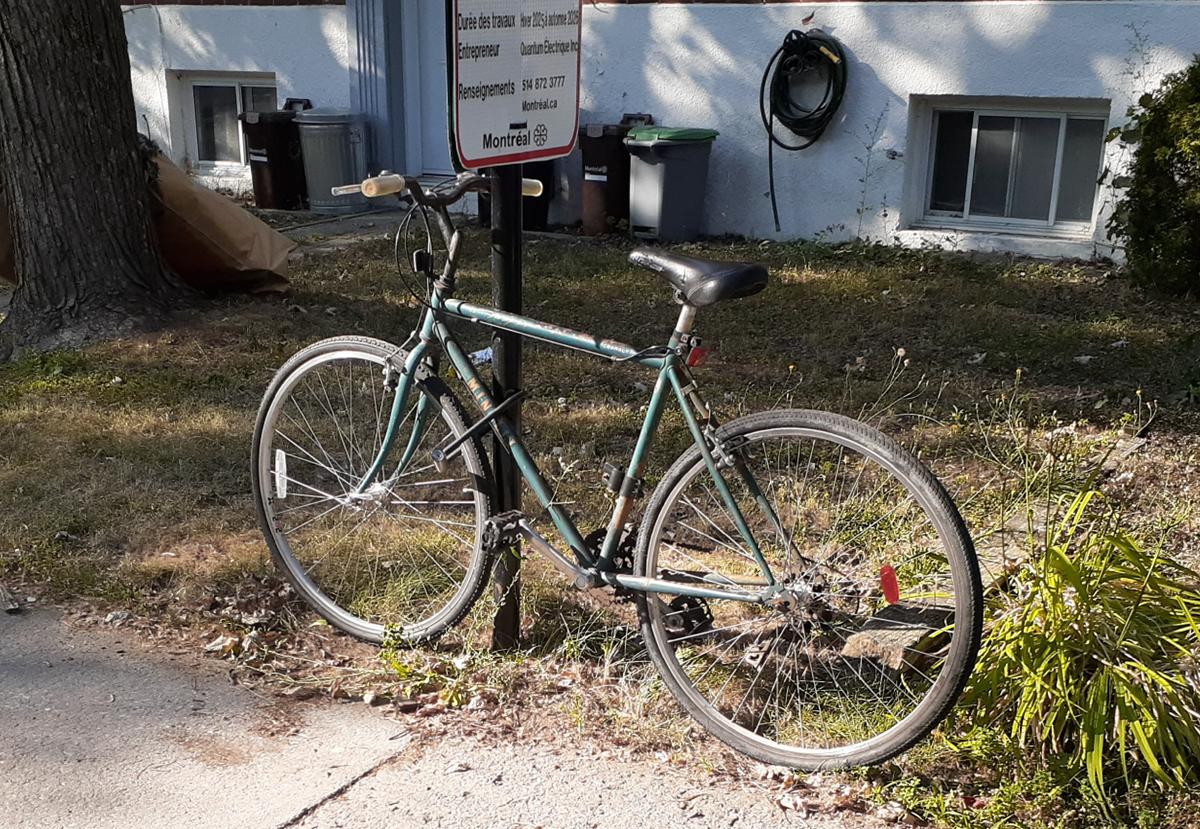 L’un des trois vélos en infraction rue Clark car attachés à du mobilier urbain non désigné à cet effet (Photo : Philippe Rachiele, JDV)