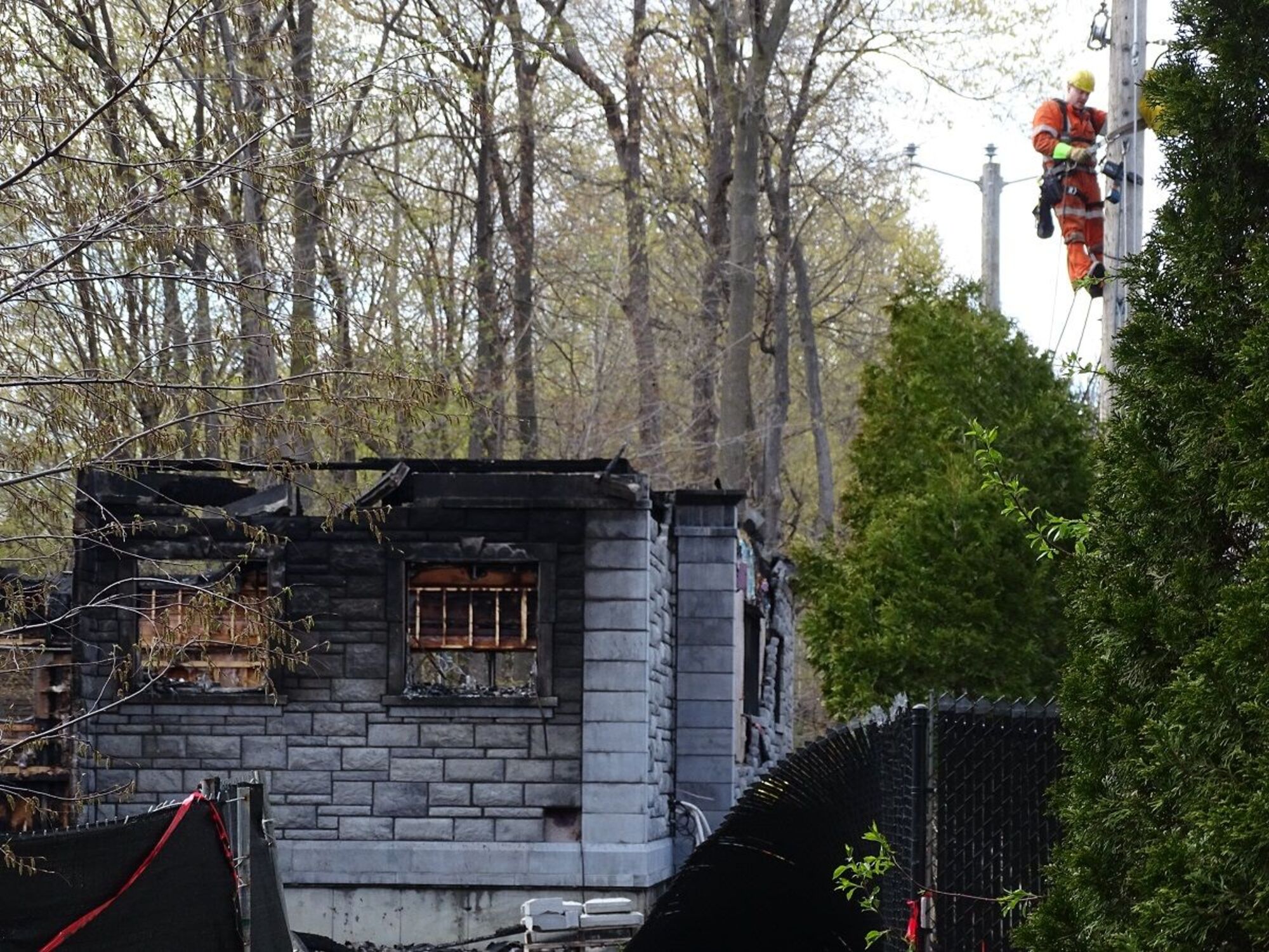 À 16 h le lundi, les employés d’Hydro-Québec s’affairaient encore auprès du Manoir de Feras Antoon de MindGeek qui a été détruit par le feu le 26 avril 2021. (Photo: Philippe Rachiele, JDV)