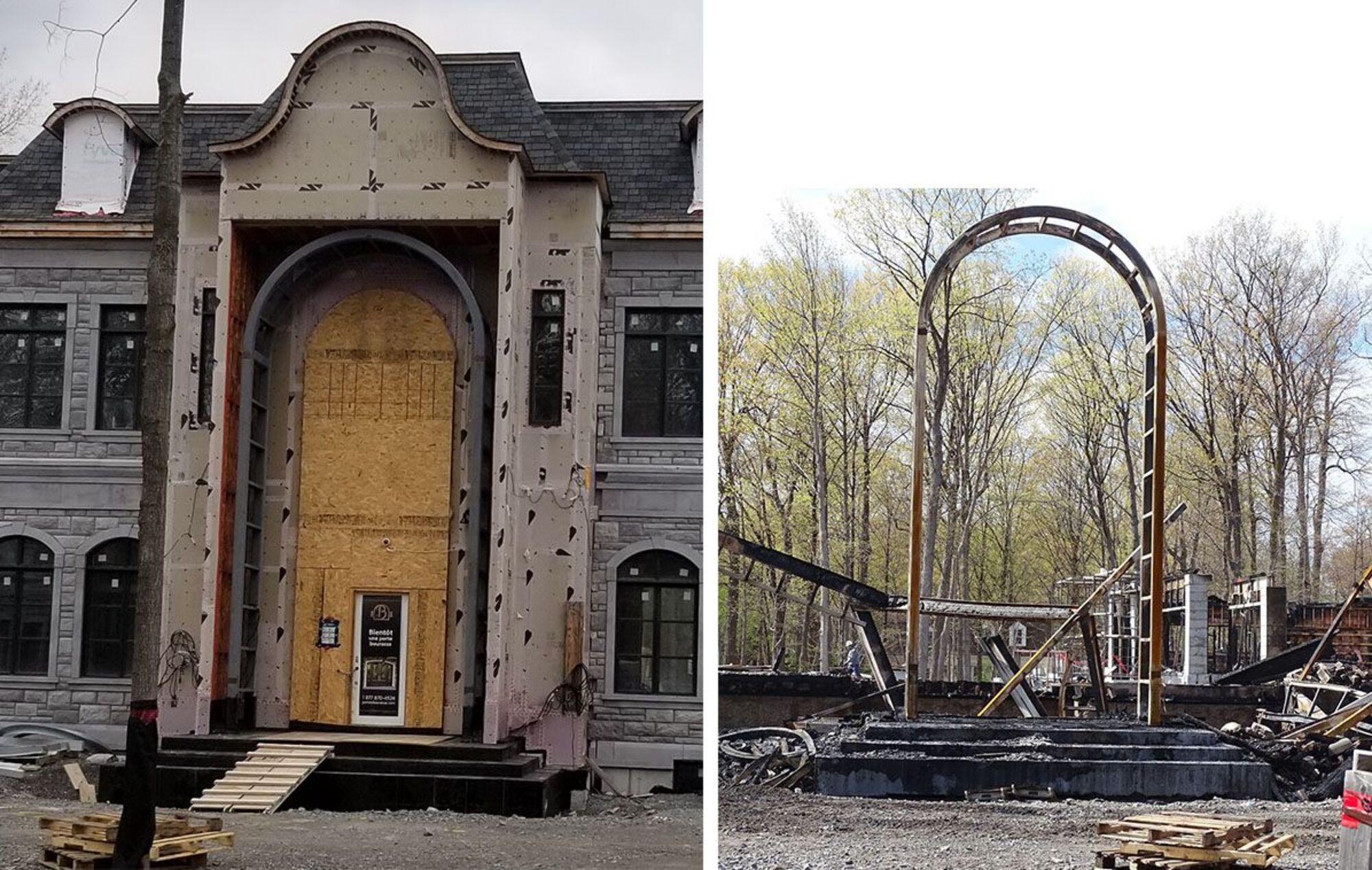 Photo avant/après de l’entrée principale du Manoir de Feras Antoon de MindGeek qui a été détruit le 26 avril. (Photos: Philippe Rachiele, JDV)