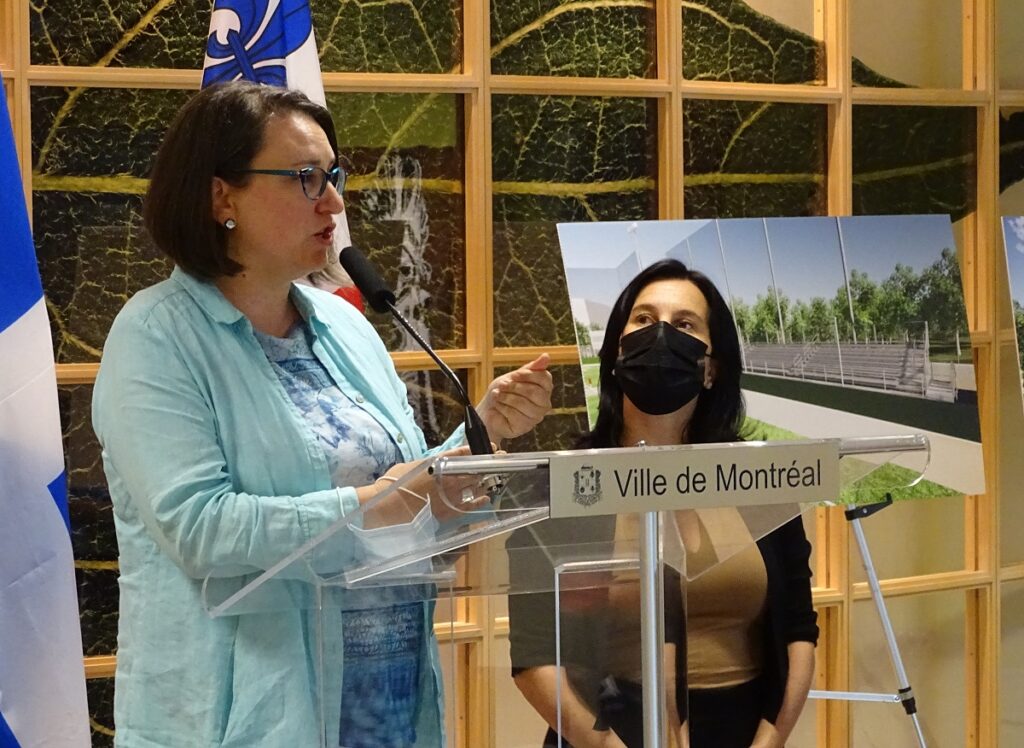 La mairesse de Montréal, Valérie Plante, et la mairesse d’Ahuntsic-Cartierville, Émilie Thuillier, ont tenu à souligner que le projet atteignait des standards écologiques élevés malgré le choix de la surface synthétique.