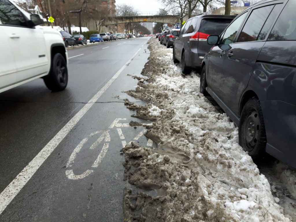 Au retour de l’événement, sur Lajeunesse, votre humble serviteur (en vélo) roulait par obligation dans la voie de droite, habituellement réservée aux véhicules. Pas le choix! On ne pouvait utiliser les bandes cyclables (enneigées). Quatre automobilistes l’ont dépassé, pour ne pas dire frôlé, sans laisser un espace d’un mètre entre leur voiture et le cycliste, comme il est recommandé aux automobilistes lors des manœuvres de dépassement.