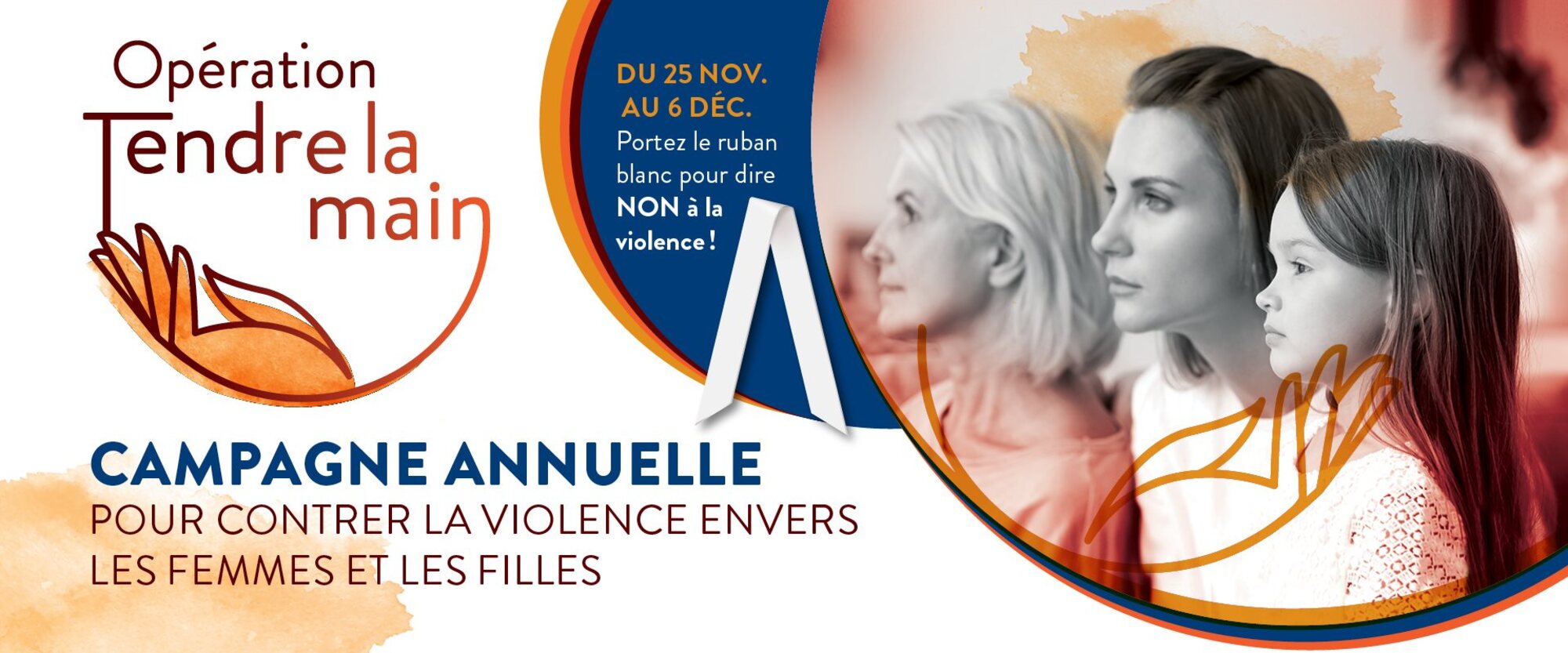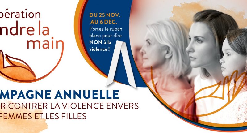 Une campagne de sensibilisation appelée « Opération Tendre la main » débutait le 25 novembre dernier. Organisée par l’Association féminine d’éducation et d’action sociale (Afeas), elle rappelle qu’au quotidien, des femmes, des enfants et des personnes âgées sont victimes de violence, peu importe leur origine ou leur lieu de résidence. Durant cette campagne, soit du 25 novembre au 6 décembre, l’Afeas invite la population, en signe de solidarité, à afficher visiblement son engagement pour contrer ces violences en portant le ruban blanc en « V » inversé.