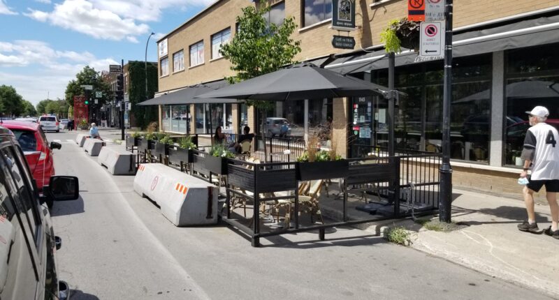 Je ne comprend pas? nous avons payé pour installer des couloirs de distanciation physique . On n’a pas cesser de nous répéter de respecter cette distance par mesure de sécurité. Tout à coup, on installe des terrasses sur ces couloirs et en plus on utilise la moitié du trottoir…allo!