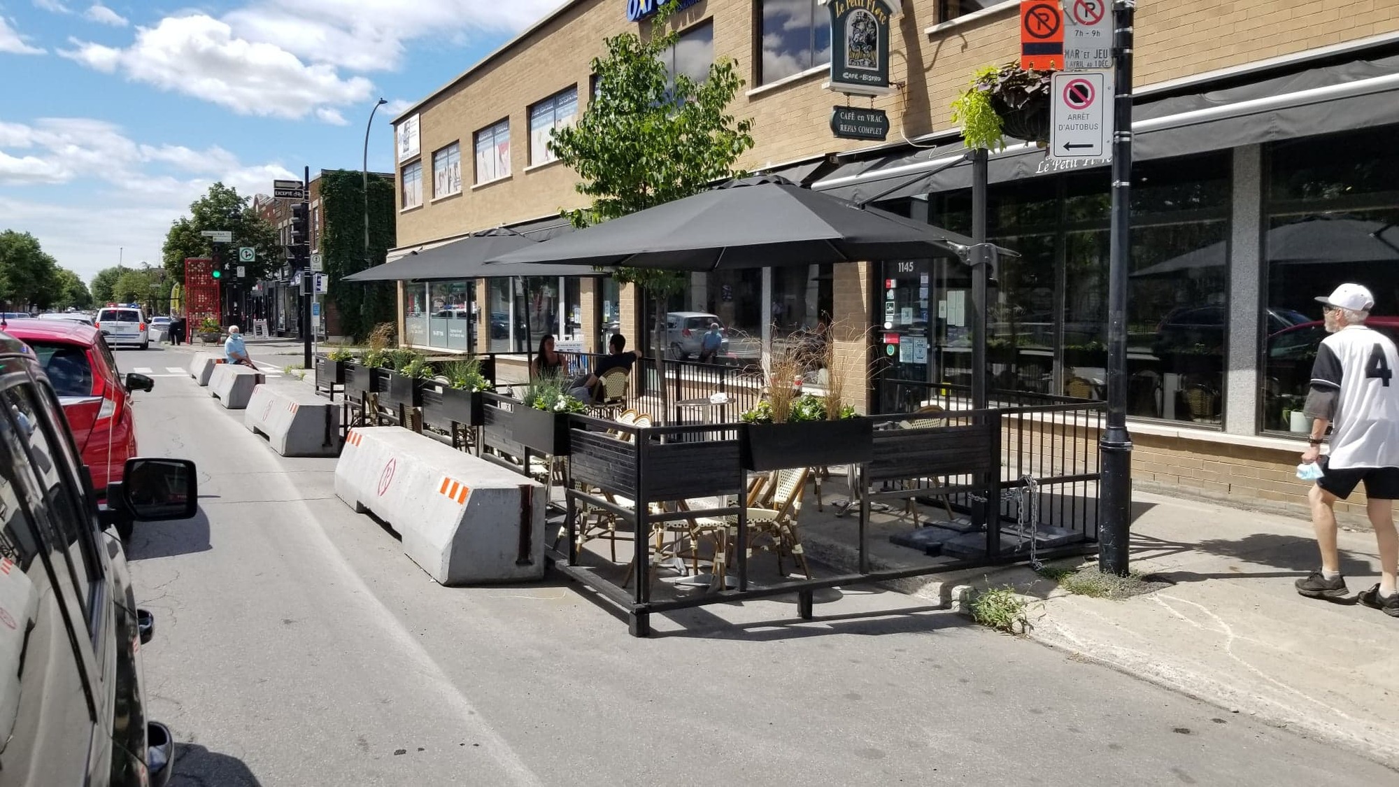 « Nous avions un arrêt d’autobus situé devant le commerce. Il y a environ cinq ans, l’arrondissement a consenti à déplacer l’arrêt d’autobus devant le commerce suivant. Il nous a aussi fallu libérer l’espace de trottoir pour les piétons afin que nous ayons la permission de mettre notre terrasse dans les places de stationnements », nous informe-t-il.
