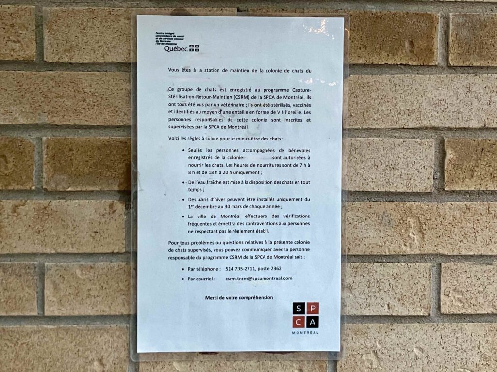 Même si le geste paraît louable, nourrir les animaux errants sur le territoire de la ville de Montréal est interdit, sous peine d’amendes. En revanche, si le bien-être des chats de la rue vous tient à cœur, vous pouvez participer, en toute légalité, au programme Capture–stérilisation–retour–maintien (CSRM) offert dans les arrondissements partenaires de la SPCA, dont Ahuntsic-Cartierville.