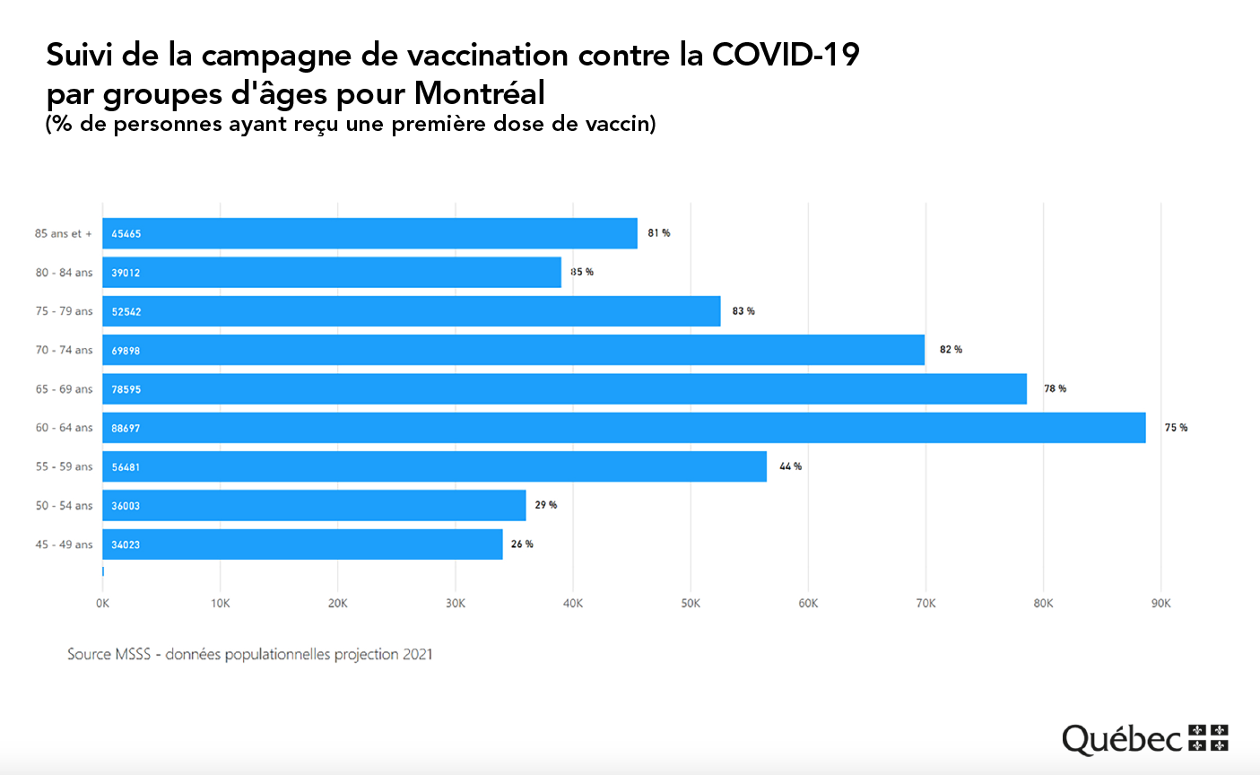 Ainsi, entre 75 et 85 % des 60 ans et plus avaient reçu une première dose depuis le début de la campagne de vaccination à Montréal.