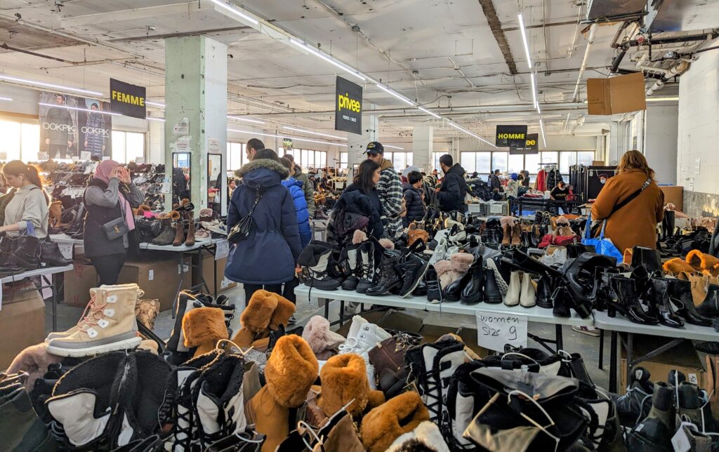 À l’arrivée au 4e étage, une file d’attente mène au hangar de vente. Chaussures, bottes d’hiver, manteaux… la plupart sont de marques bien connues, mais à des prix défiant toute concurrence. Dans les rayons, les clients cherchent leur taille, essaient et finissent souvent par craquer.