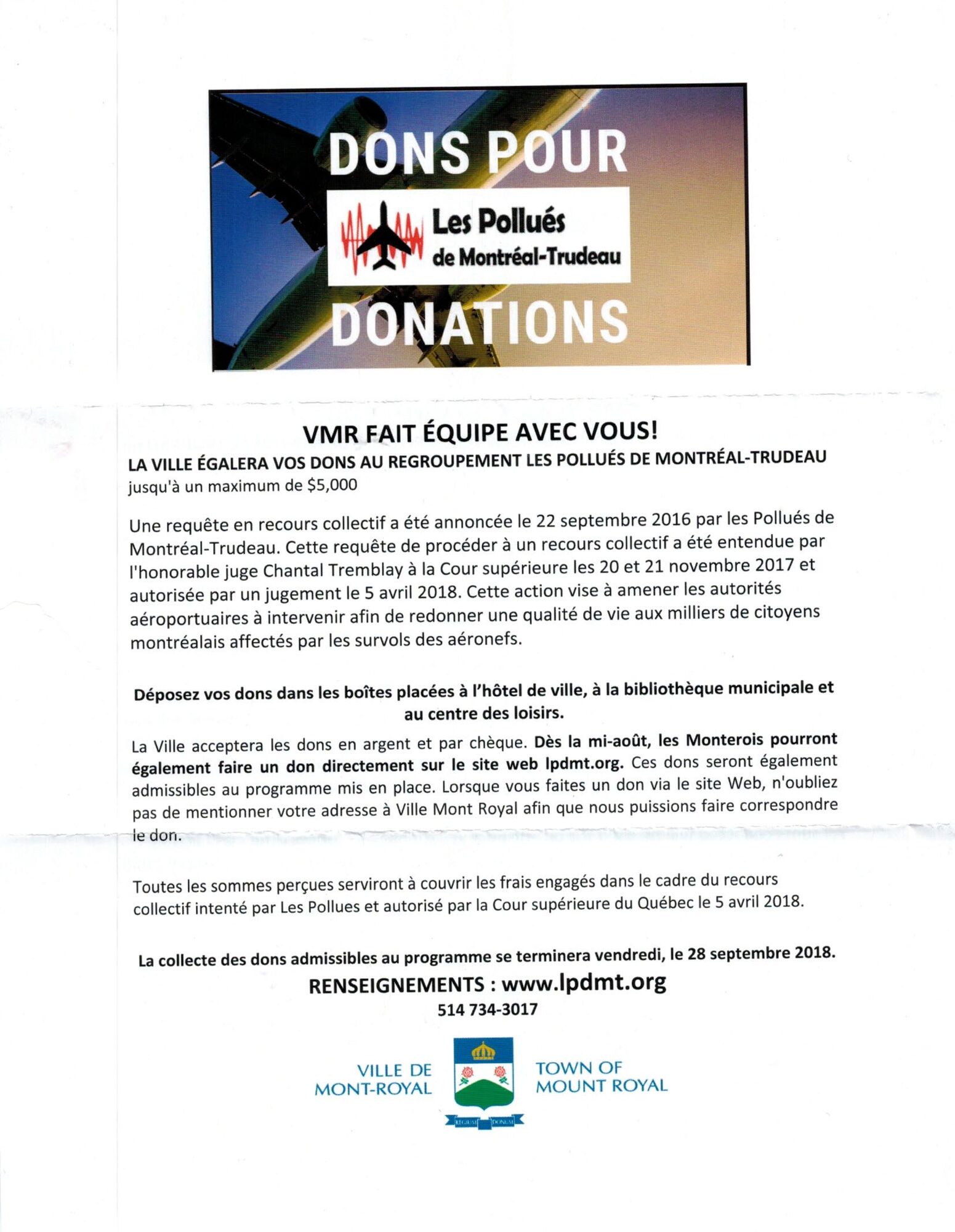 « Des résidants de Ville Mont-Royal sont aussi de la bataille et se sont joints aux Pollués de Montréal-Trudeau, a indiqué le maire Philippe Roy au archive.jdv.symbiodev.xyz. Ceux qui participent à une levée de fonds ont demandé notre collaboration. On embarque dans ce genre de procédé et ce, de façon sporadique. On va donc accoter les montants versés jusqu’à 5000$. Nous avons déposé des boîtes pour les dons. Quand la campagne sera finie, (fin septembre), on égalera les montants recueillis », a-t-il indiqué.