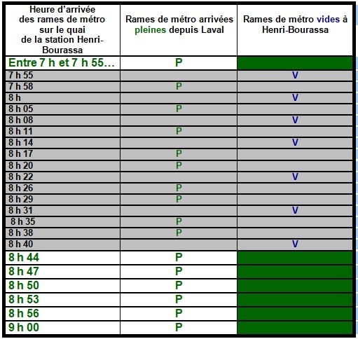Journaldesvoisins.com note, qu’en-dehors de ces heures de pointe [07 h 55 à 08 h 44], il n’y a pas de rame de métro vide qui part directement de la station Henri-Bourassa.